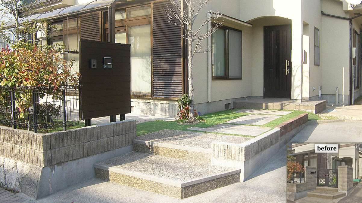 ブロック塀と門扉撤去 目隠しフェンス設置 サイン設置 インターホン移設